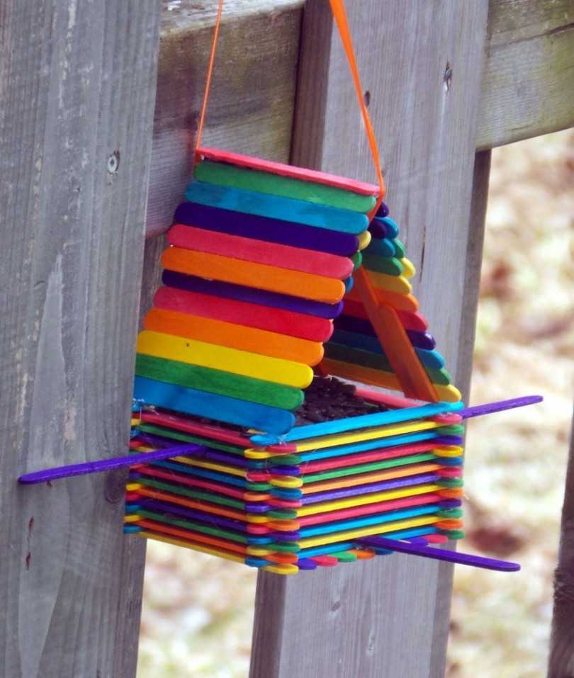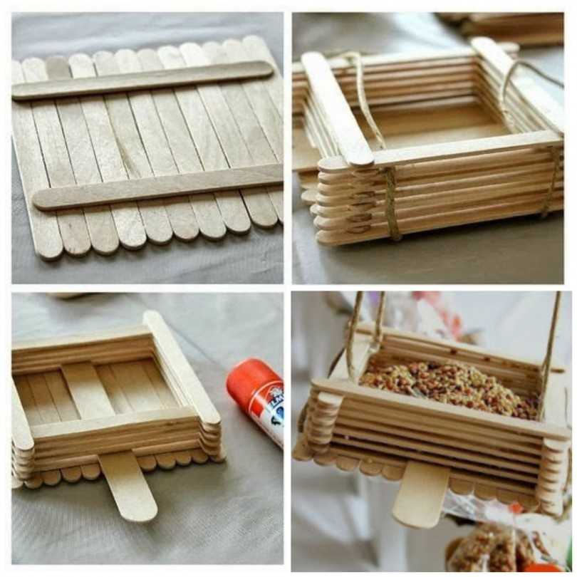 Из палочек можно сделать и такое полезное устройство, как кормушка для птиц. Ввиду приближающейся зимы это особенно актуально. Кормушку можно изготовить по тому же принципу, что и коробки для хранения вещей. Остается только подвесить ее на веревке на дерево, предварительно наполнив кормом.