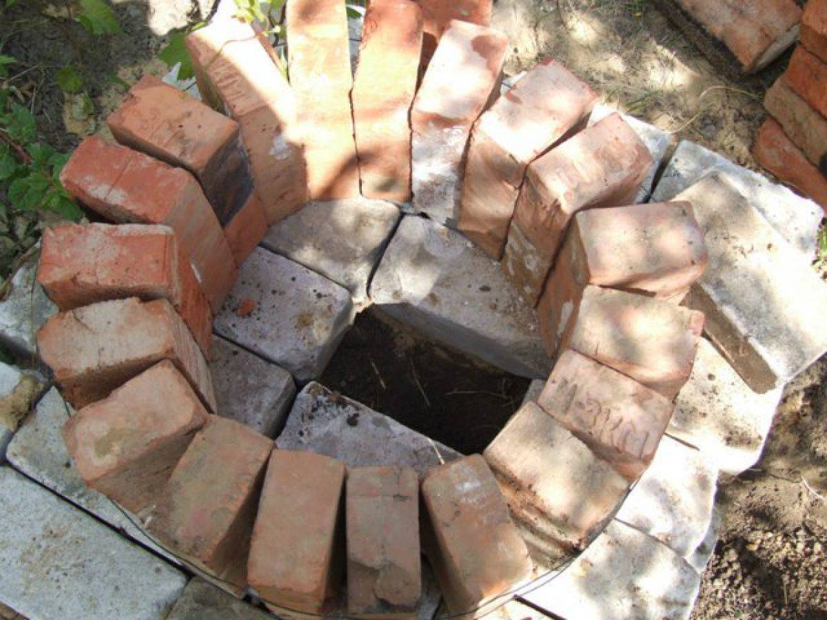 Кладку ведут упрощенно, первый кирпичный ряд устанавливают без раствора по выполненной разметке. Укрепляют кладку наружной обвязкой и скрутками из проволоки, скрученные концы прячут в зазор между кирпичами. Последующие ряды устанавливают вертикально на предыдущие, без перевязки, скручивая проволокой, а затем обмазывают всю конструкцию жаростойким раствором. Раствора нужно много, чтобы заполнить все зазоры между кирпичами. Перед обмазкой кирпичи нужно хорошо смочить водой, поскольку они являются хорошей «губкой» и могут вытянуть из растворной смеси слишком много воды. Высыхание раствора должно быть медленным, от жары или дождя конструкцию следует укрыть. После того, как высохнет раствор в зазорах, выполняют «штукатурку».