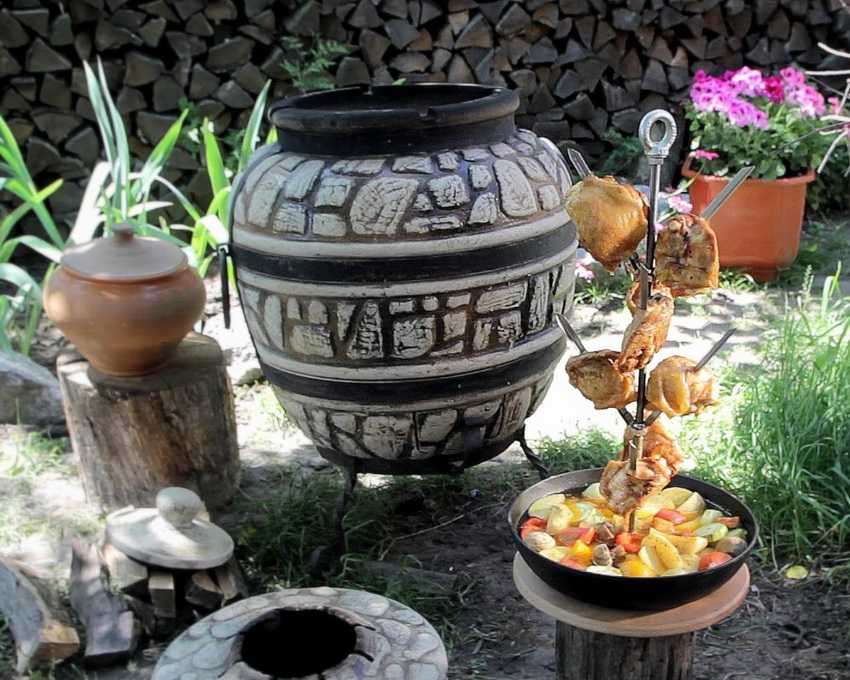 Этот вид печи пришёл к нам из среднеазиатских стран. Он подходит для приготовления самых разных блюд: лепёшек, шашлыка, шурпы. Готовят в тандыре и плов. Для этого казан устанавливается сверху, на место крышки.