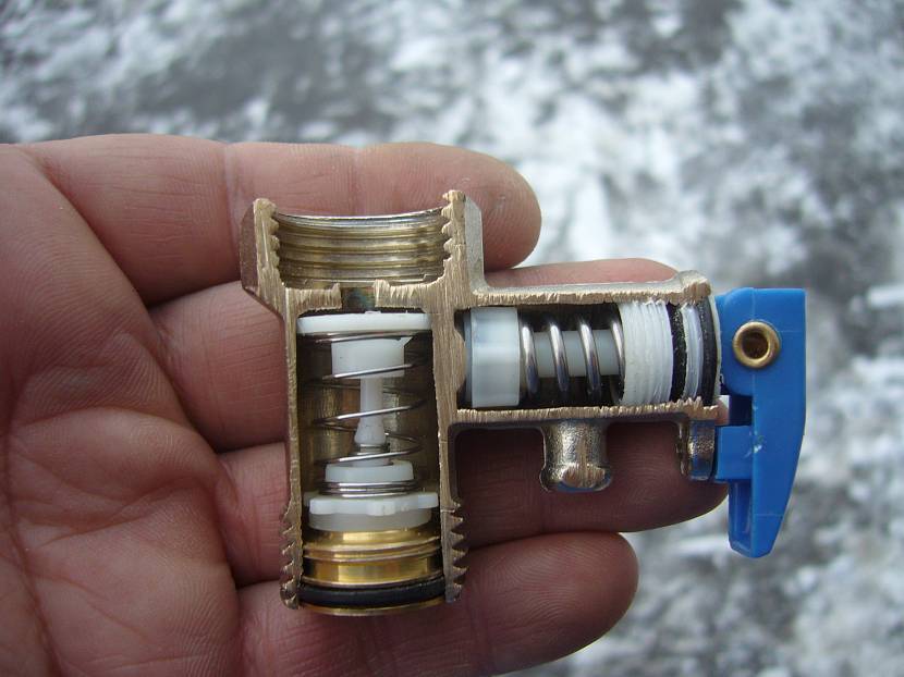 Второй пружинный механизм располагается на отводной части устройства, а функция такого элемента представлена водяным сбросом в условиях повышения показателей давления.