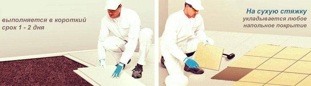 - Экономия времени – на сухой стяжке можно начинать монтировать пол буквально в тот же день, когда ее установили, в отличие от мокрой, полного высыхания которой нужно ждать до четырех недель.
