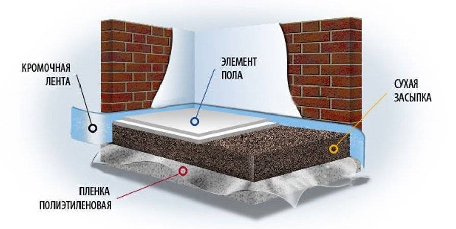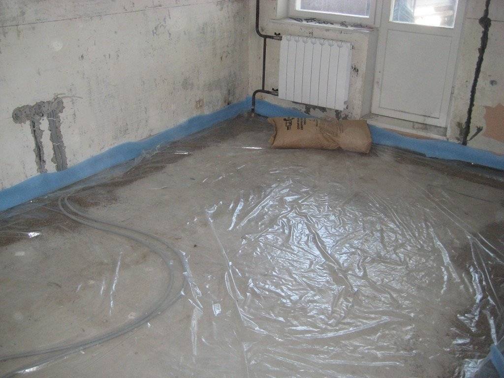 На бетонную основу полов укладывается полиэтиленовая пленка, которую используют как гидроизоляционную защиту.