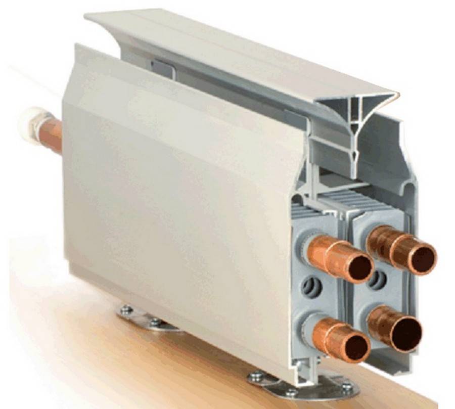 Конструкция плинтуса довольна проста. Верхняя труба, как правило, выходит из системы газового котла, проходит через весь периметр обогреваемой площади и переходит в нижнюю обратную трубу. Нижняя труба возвращает охлаждённый теплоноситель в газовый котёл.