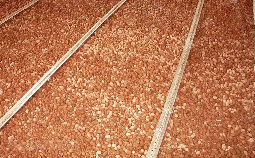Если в полу предусмотрена система подогрева, поверх насыпного утеплителя укладывают плиты ЭППС или ППУ с герметизацией стыков. Следом идет устройство подготовительной и основной бетонной стяжки общей толщиной слоя в 7–10 см и одной линией сетчатого армирования.