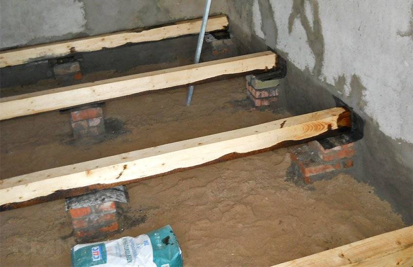 Перед укладкой лаг на тумбы древесина обязательно подвергается пропитке антисептиком, однако состав не должен быть токсичным, потому отработку и креозот лучше не использовать. Тумбы также покрываются сверху 2–3 слоями рулонной или обмазочной изоляции.