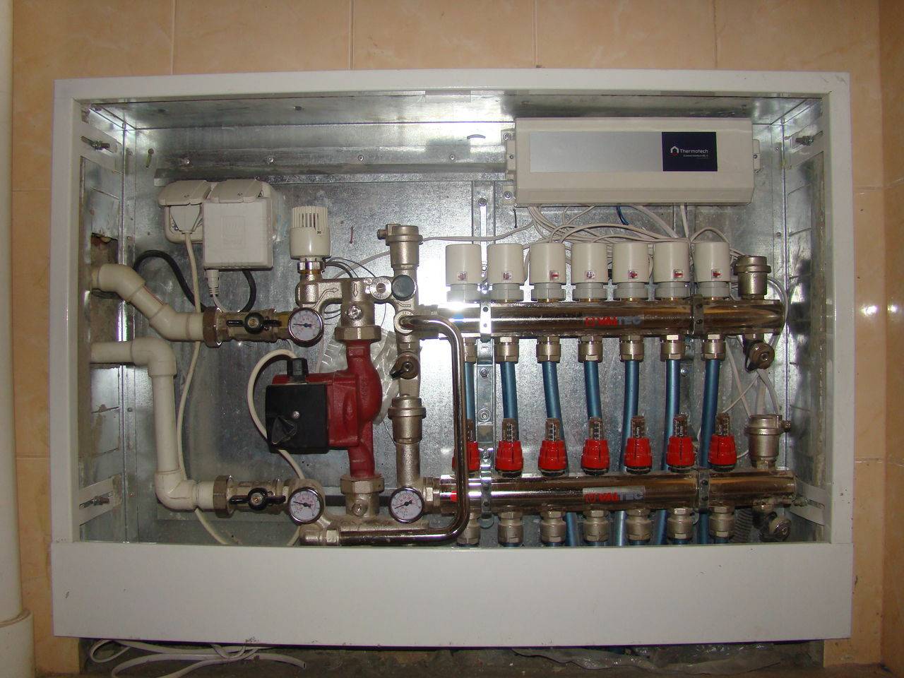 Его основной задачей является работоспособность всей системы водяного отопления. Он так же поддерживает установленную на терморегуляторе температуру. Здесь не стоит экономить. Следует покупать такой аппарат, в котором есть датчики сливного крана, протока и кран Маевского. Последний отвечает за отсутствие воздушных масс внутри водяного теплого пола в частном доме. Отдельно нужно будет подобрать щиток.