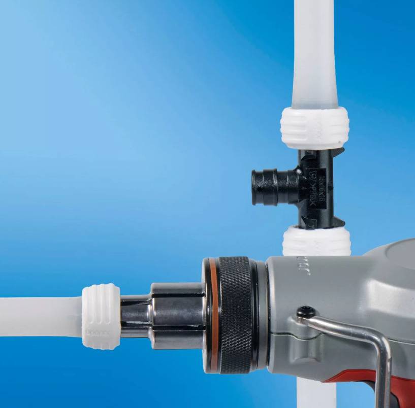 Для соединения труб используют метод напрессовки. Для этого необходимо иметь в наличие расширитель с насадками. Выбирают насадку определённого диаметра. На трубе располагают обжимное кольцо. Далее работают с расширителем. Насадку вставляют в расширитель и надевают на трубу. Изделие поворачивают на 1200, выдерживают 1 мин. Затем, расширитель изымают и вставляют в увеличенное отверстие фитинг. Выжидают 1-4 мин. Пластик примет первоначальную форму, плотно удерживая фитинг.