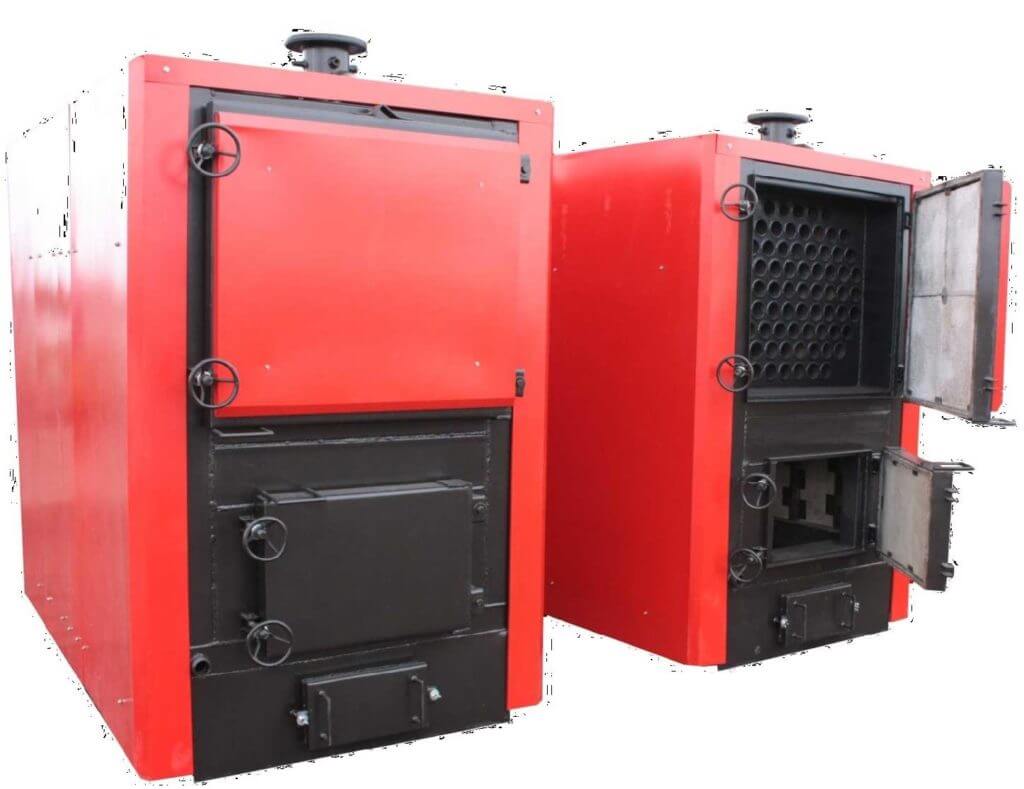 - Классические котлы. В таких аппаратах основной принцип состоит в том, что тепло подается через пламенное горения топлива. Они имеет две дверцы: одна предназначена, чтобы загрузить топливо, другая – для чистки от золы и прочих продуктов горения. Работают на дровах и угле, а отличить их можно по материалу, используемому при изготовлении – чугун либо сталь.