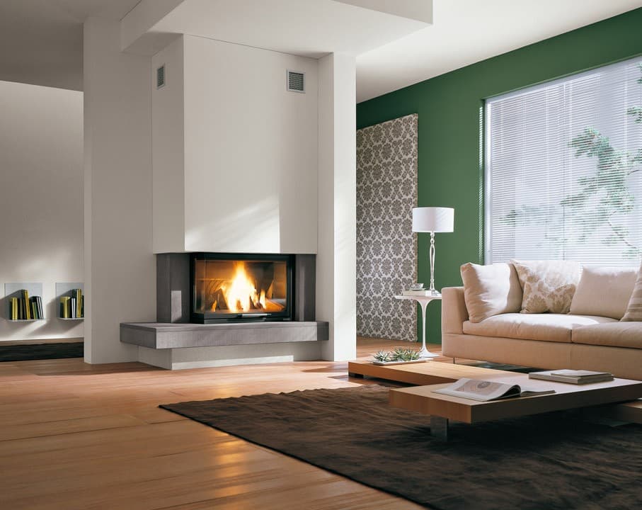 Угловые топки представляют закрытые конструкции, в которых предусмотрены два широкопанорамных стекла и еще одно стекло в форме латинской L. Для эффектного визуального восприятия их делят специальной металлической гранью.