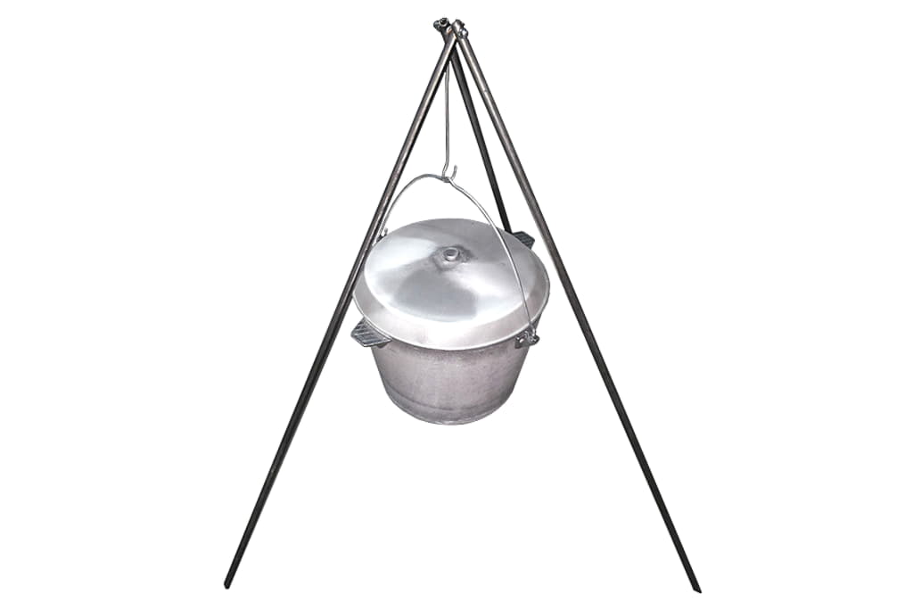 Туристский способ сэкономить место в рюкзаке – возить с собой только металлический трос или цепочку, на одном конце которой есть крюк для котелка, а на втором – хомут для стягивания. Подходящие палки для треноги можно найти на месте или срезать с дерева, а затем установить под нужным углом и стянуть вершину конструкции. На нижней части цепочки подвешивается котелок или казан.