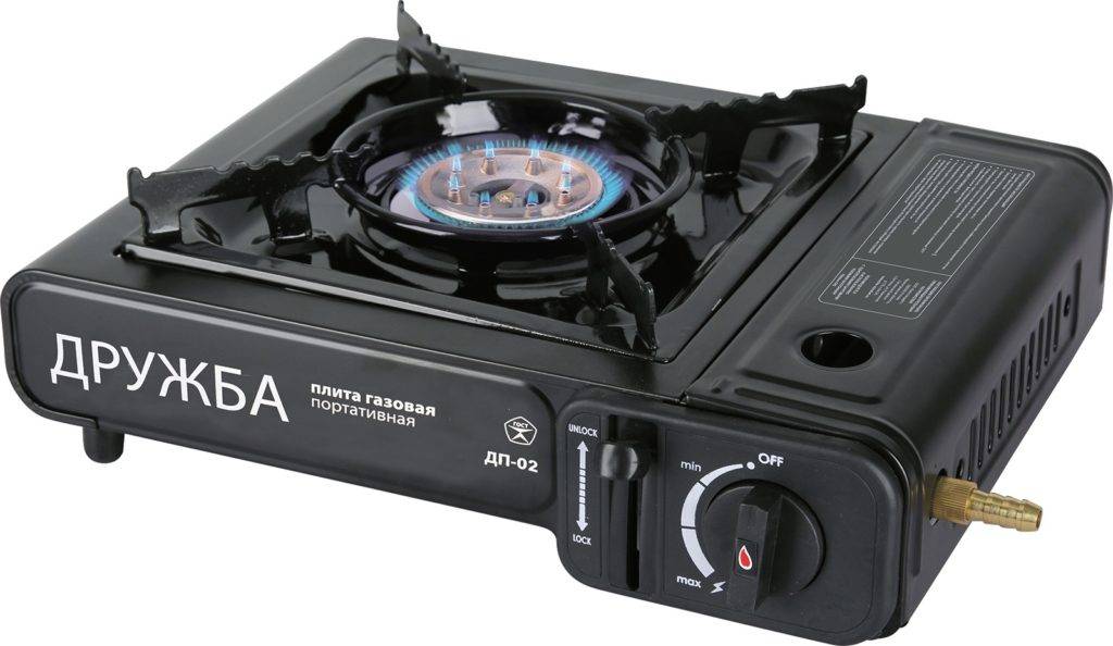 Походная газовая плитка с возможностью работы как от цангового, так и от бытового баллона, для этого комплектацию включен специальный соединительный переходник. «ДРУЖБА» понятна и удобна в использовании. Корпус выполнен из холоднокатаной стали и покрашен глянцевой черной краской. Конфорка из алюминия. Для съемного баллончика предусмотрен отсек с крышкой. Оснащена пьезоэлектрическим розжигом и регулятором пламени.