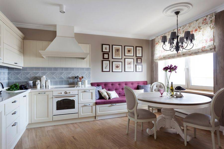 - Прованс. Цвета — белый, кремовый, голубой, розовый. На пол ламинат, на стены обои в легкомысленных цветочках, потолок оштукатурить. Мебель легкая, из натуральных материалов. Шторы в стиле кафе, закрывающие только половину окна. На столе обязательно ваза с цветами.