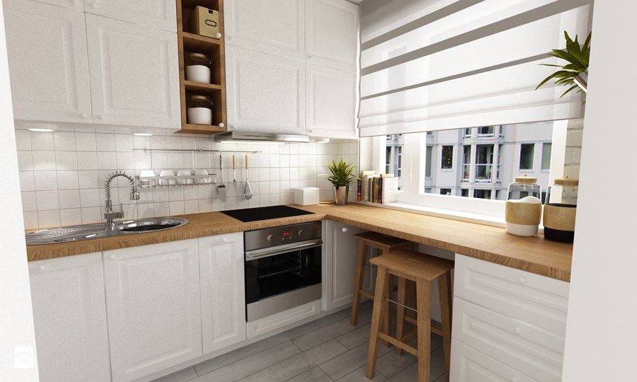 Если же кухня маленькая, то можно в интерьере применить деревенский стиль. Этот популярный стиль подразумевает снятие всех дверок со шкафов, а вместо них весятся небольшие занавески.