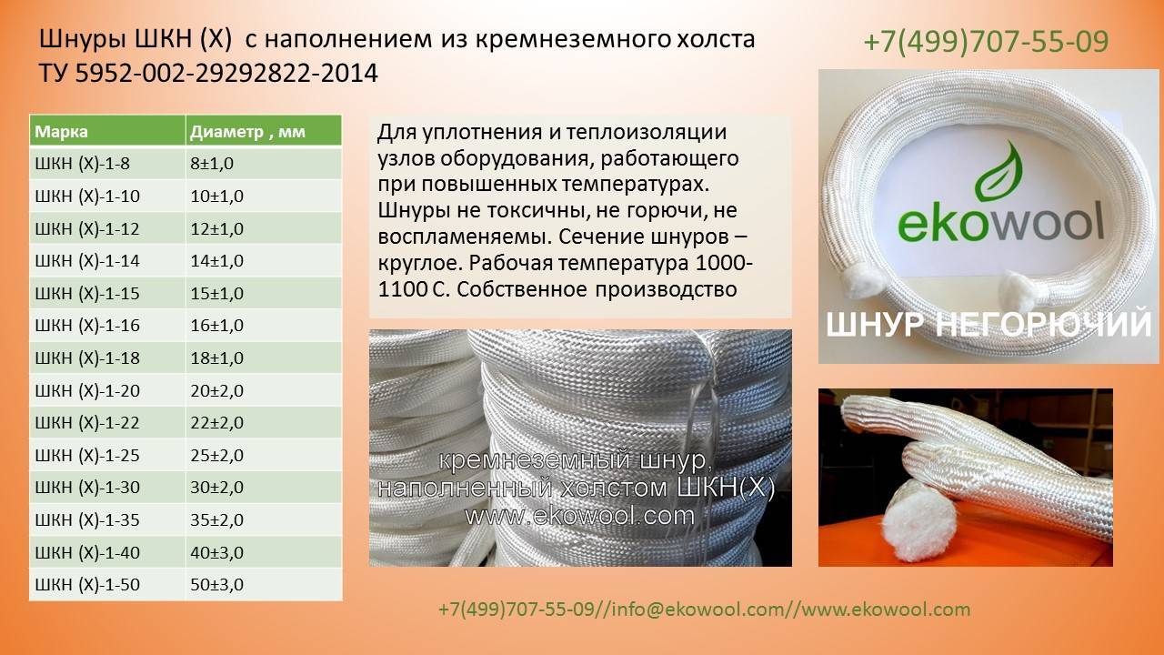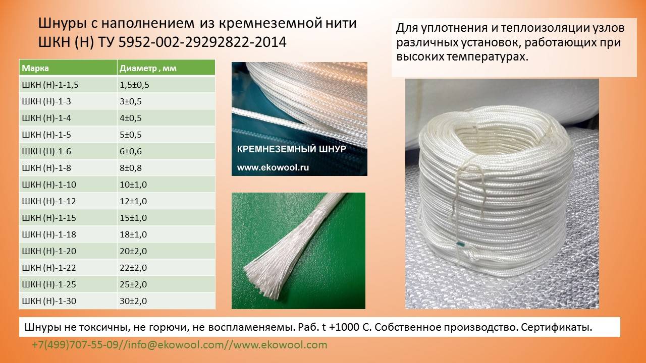 Шнуры негорючи, невоспламеняемы, экологичны. Рабочая температура от -60 С до 1200С градусов.