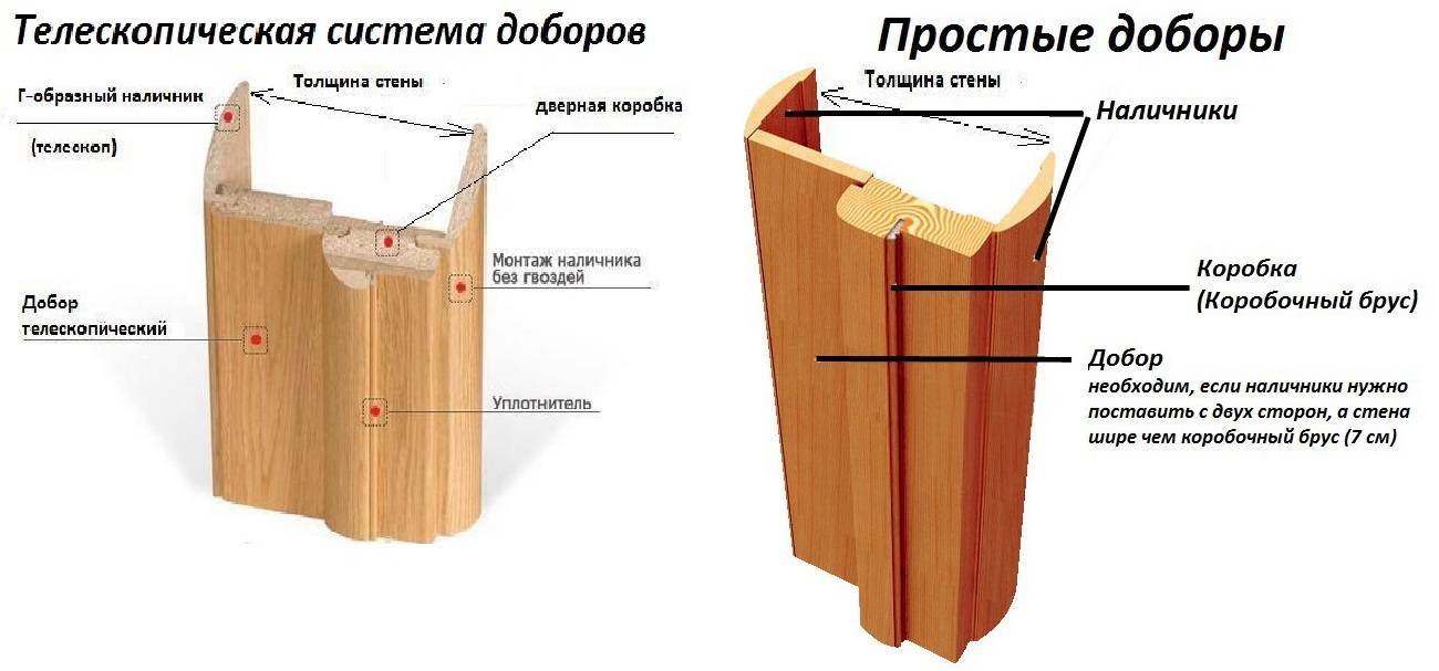 Телескопический. Доборный элемент для дверей внешне напоминают вагонку с продольным соединением на кромках шип-паз. Собирается в монолитную конструкцию нужного размера и используется при большой ширине стены с возможностью точной подгонки в пределах 10–20 мм. Установка не требует дополнительных креплений.