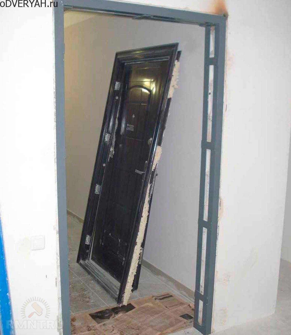 В большинстве случаев, начиная устанавливать стальную дверь своими руками, ее располагают заподлицо к нижней плоскости стены. Однако при желании можно заглубить дверной проем. Когда выбран первый вариант закрепления дверной коробки, работу выполняют при помощи анкерных пластин. Фиксация дверной коробки посредством анкерных болтов, проходящих через нее, предопределяет второй способ. Или же для закрепления могут использоваться стальные прутья как замена фабричным анкерам.