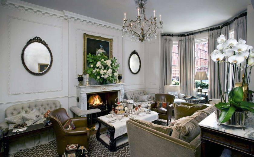 - Диван с креслами должны стоять симметрично камину. В классицизме часто используют и журнальные столики, который должен стоять на одной оси с мягкой мебелью.