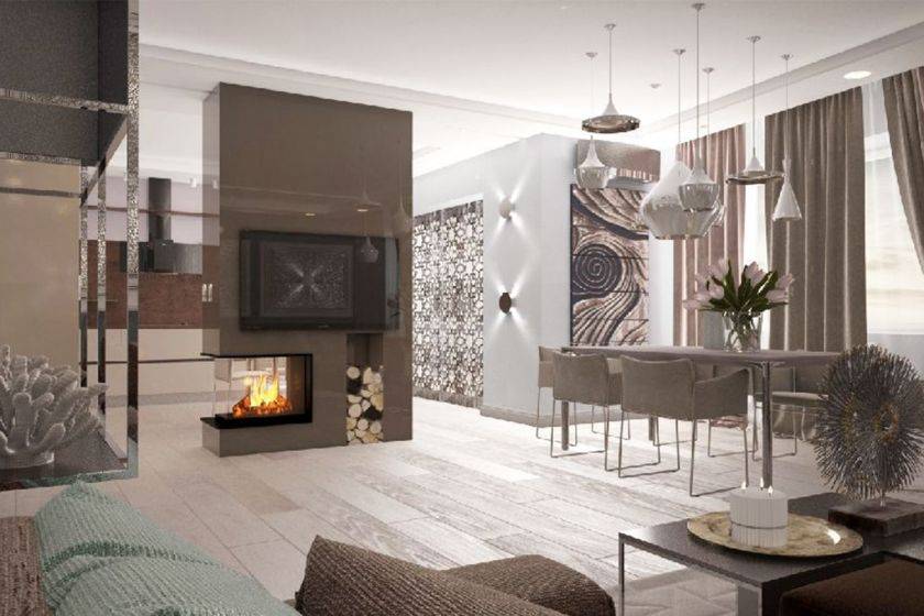 В минимализме предпочитается фрагментация на зоны. Ориентация происходит по самому большому объекту. Так как в дизайне квартиры с камином он самый крупный, по нему и происходит распределение мебели.