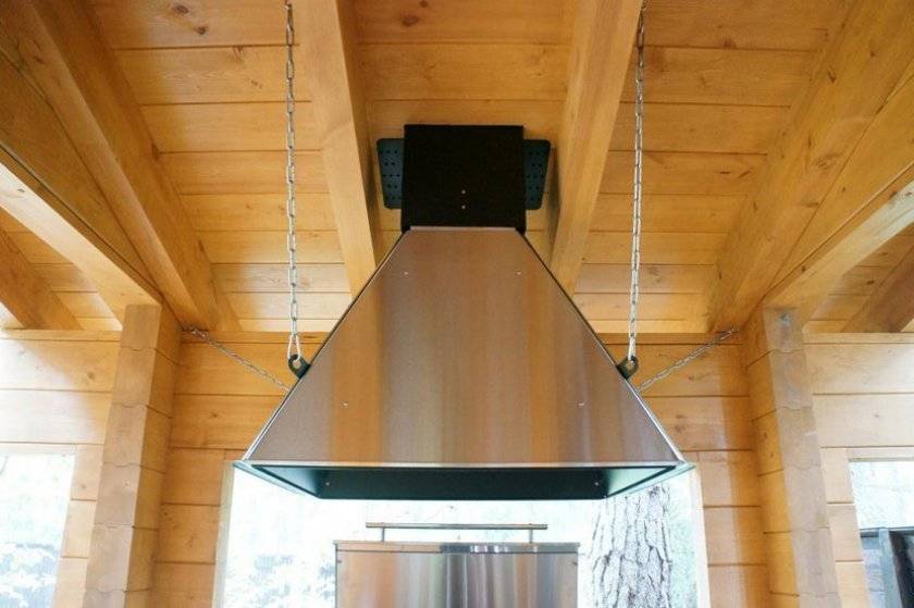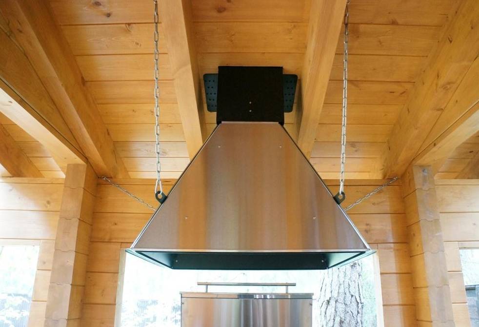 - Вытяжка для мангала может быть декорирована и деревом — металлический вытяжной зонт обшивается деревом с использованием термоизоляционных прокладок.