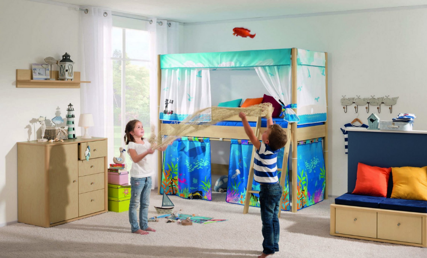 Зонирование по вертикали – усложненный вариант. Участки спальни выносятся на разные высоты. Детям такое разграничение по душе, так как появляется свой уголок, особенно если в комнате проживают двое.