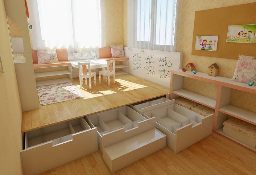 Если детская большая, производить зонирование лучше при помощи перегородок. Они помогут отделить рабочее место от спальни и игровой. Хорошо смотрится в девичьей комнате подиум. Хозяйка даже во взрослом виде будет ощущать себя принцессой, которой хочется всегда демонстрировать свою красоту. Подиум – лучшее, что можно для этого придумать.