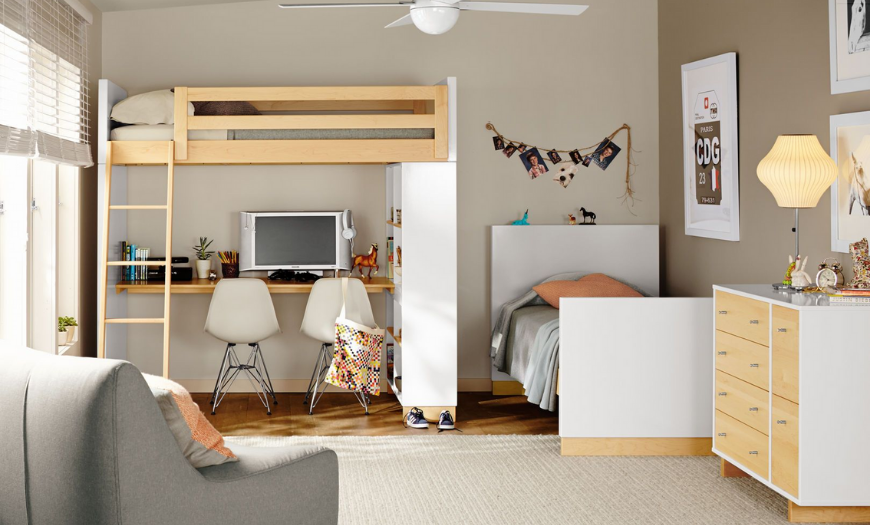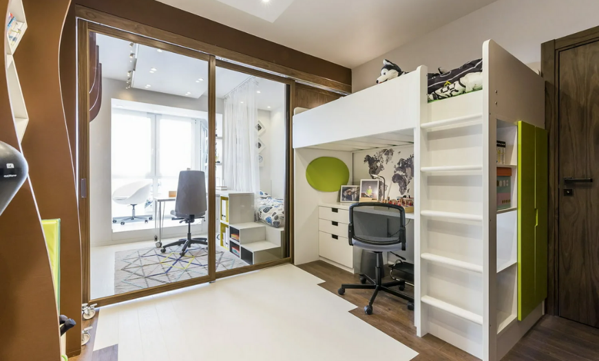 - Вместо кровати рекомендуется использовать многофункциональную «чердачную» конструкцию, где сверху можно спать, а снизу заниматься уроками.