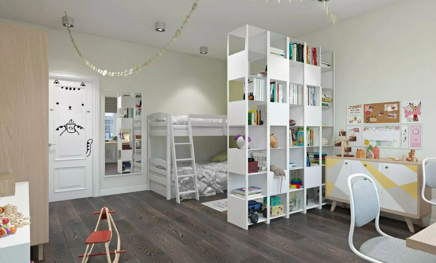Пространство разделяют шкафом или стеллажом. Обычно зоны для игр и учебы располагают в отдаленности, обустраивая между ними участок для сна и отдыха. Так, выше вероятность, что ребенка не будет тянуть ко сну в процессе работы. Если же расположить постель возле компьютерного стола, эффект будет противоположный.