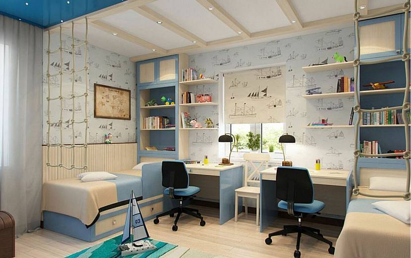 Правила подготовки детской комнаты для мальчика мало чем отличаются от девчачьей комнаты. По материалам и помещению для двоих детей советы остаются прежними. Цвета интерьера тоже рекомендуется сделать спокойными, но вместо розовых и персиковых оттенков использовать голубые и зеленые цвета.