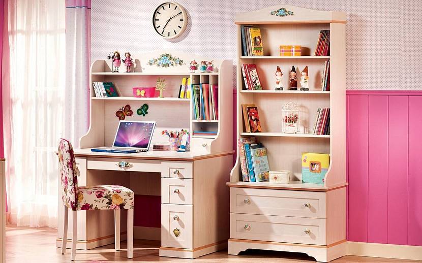 Наполнение мебели практически такое же: рабочий стол, удобная кровать. Девочкам плохо подходит ярусная меблировка. Но если в душе девочка – настоящий сорванец, можно рассматривать покупку кровати чердака.