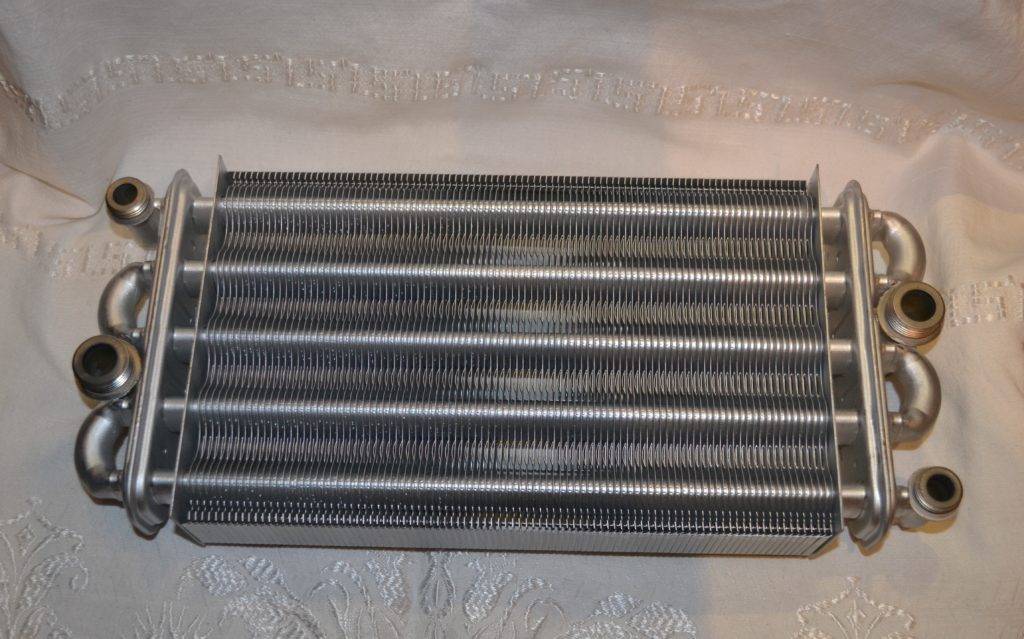 - Теплообменника. Представляет собой миниатюрный радиатор, изготовленный из стали или чугуна. Последние остаются исправными до 25 лет.