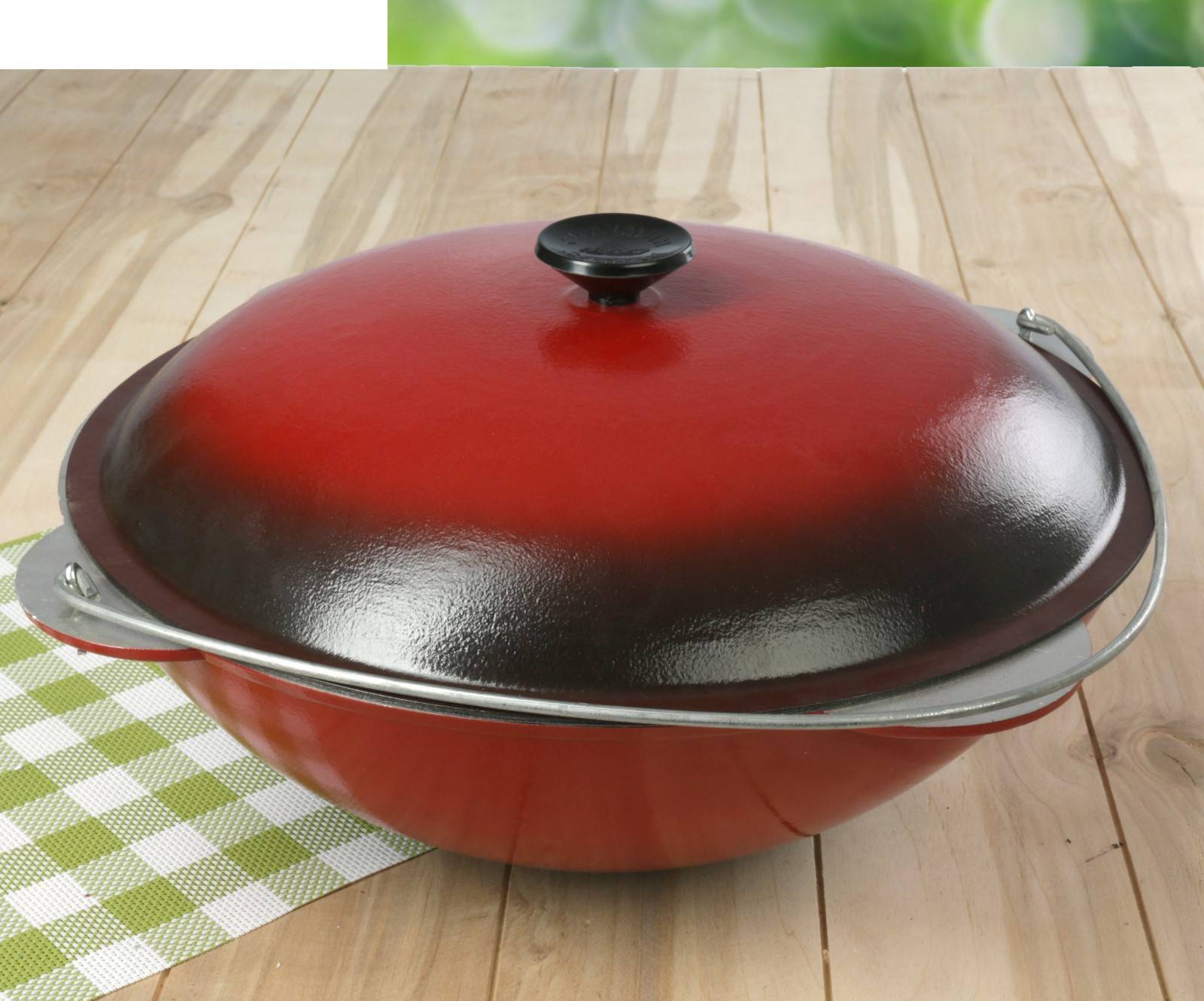 Далее в рейтинге находится чугунный казан с алюминиевой частью наверху объемом 7 литров. Этого размера достаточно на семью из 4-5 человек. Посуда довольно тяжелая. Высота – 15 см, вес с крышкой – около 6 килограммов. Стенки и дно у нее очень толстые.