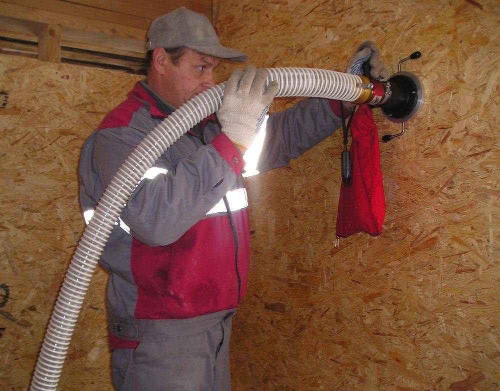 Выдувная машина для задувки эковаты делает теплоизоляционный материал рыхлым. В дальнейшем вата поступает по шлангу. Следует помнить, что диаметр шланга должен быть такой же, как и диаметр отверстий.