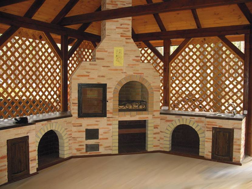 Универсальный вариант — беседка с барбекю-комплексом с коптильней, где можно приготовить максимум блюд для компании друзей и близких.